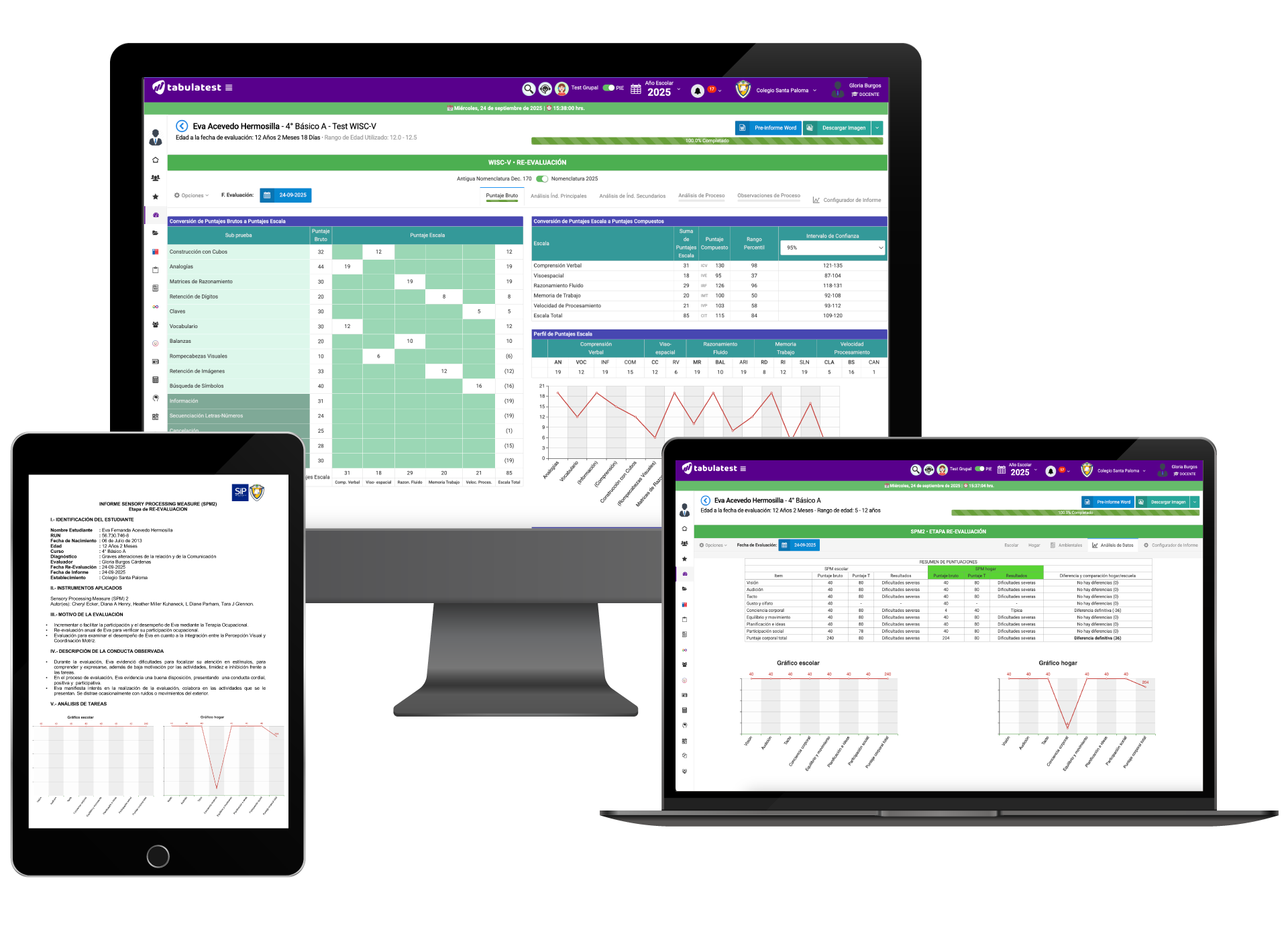 Se genera un documento automático integrado con los resultados de las pruebas WISC V y Conducta Adaptativa en un mismo informe.