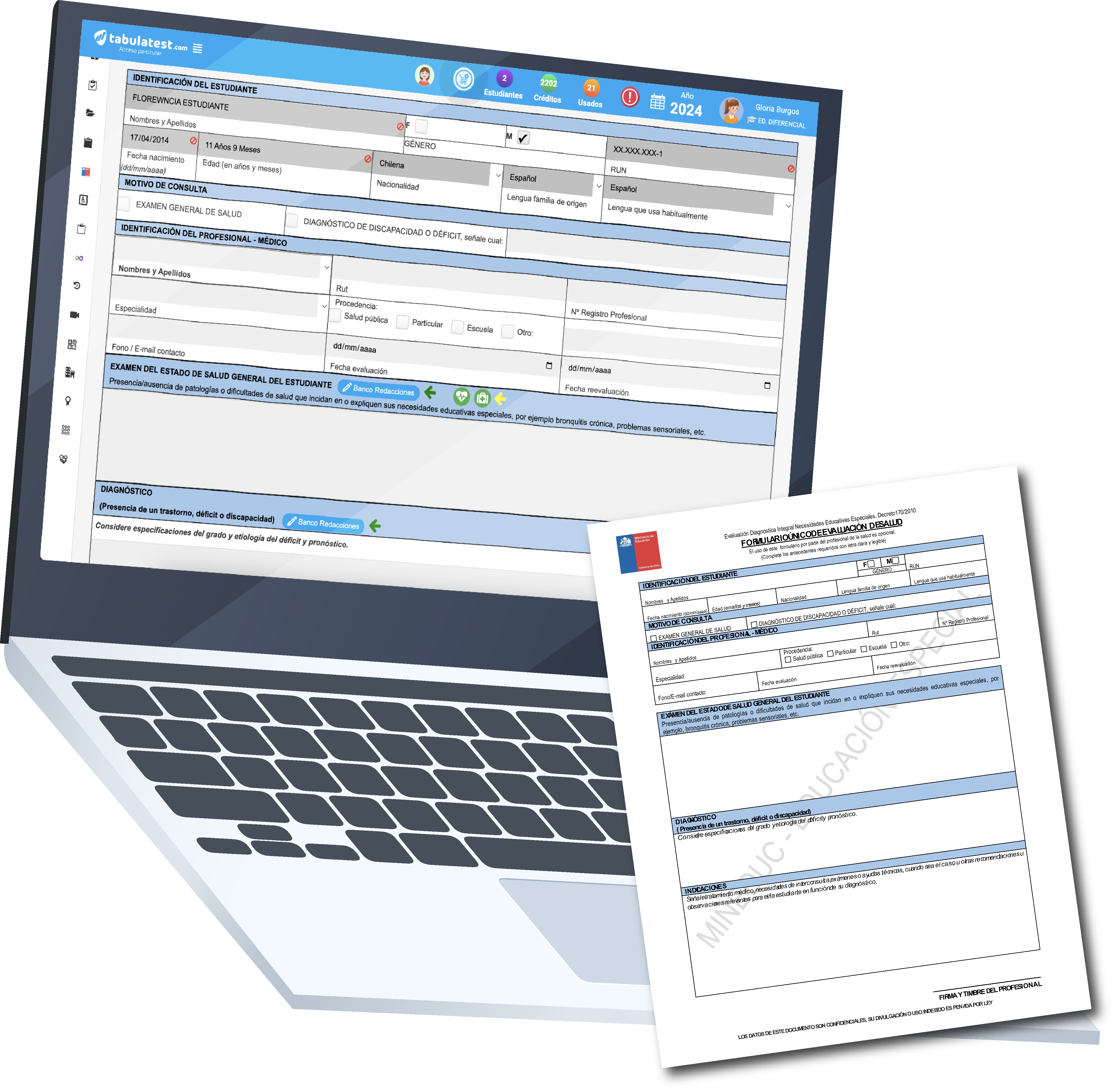 El nuevo formato, alineado con la normativa del Mineduc, incluye el Examen del Estado de Salud del Estudiante y el Diagnóstico Médico. Además, viene optimizado con un Banco de redacciones predefinidas junto con el cálculo automático del IMC del estudiante, agilizando y optimizando el proceso de evaluación.